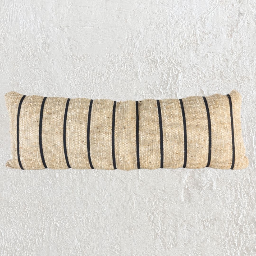 Handcrafted cotton cushion with elegant black applique stripes. Offered in two size options.
