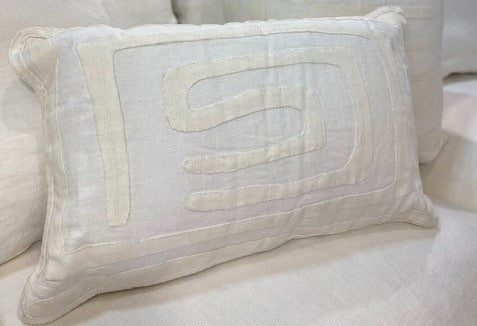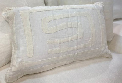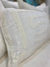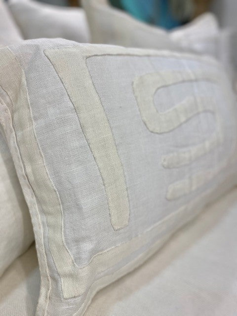Linen Cushion. Feather filled, hand stitched in India. These cushions add a fresh and unique look to any living space. Off white linen appliqued on to white linen. A take on the mud cloths of Africa.