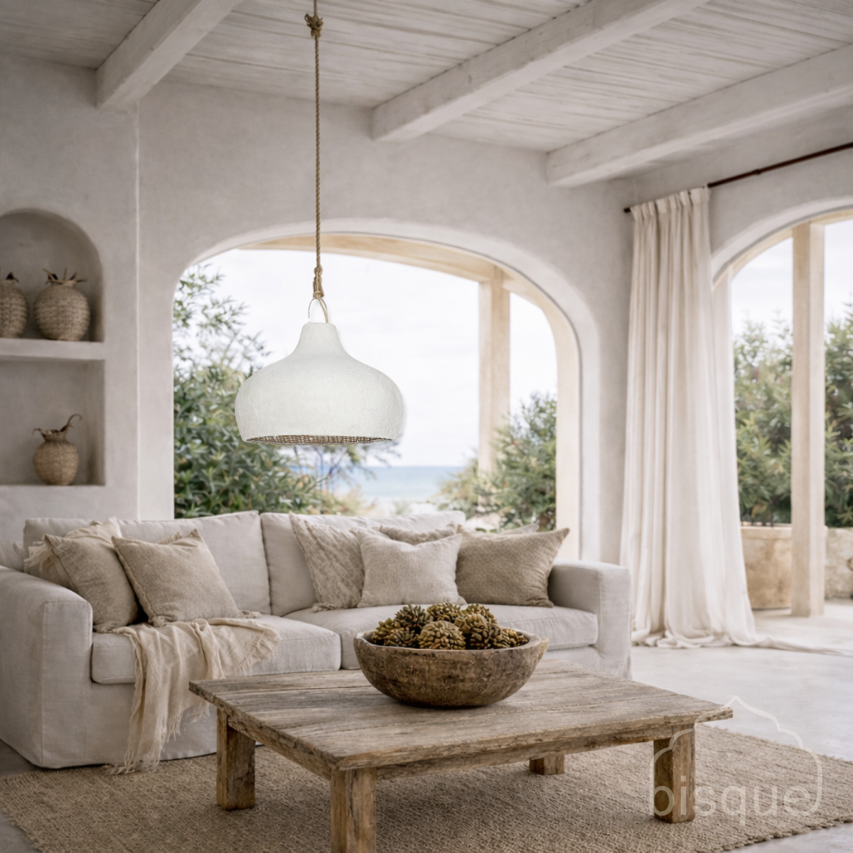 The Aquarius Fish Trap Clay Pendant Light is a refined reinterpretation of a traditional African basket, crafted from white clay to bring an artisanal touch to your space. Measuring approximately 60-62cm in diameter and 48-50cm in height, each pendant is handmade by skilled artisans, ensuring unique variations in design, pattern, and color that enhance its natural beauty. Beyond its aesthetic appeal, the clay material helps maintain freshness when used to hold fruits or vegetables, blending functionality with elegant craftsmanship. This pendant light offers a sophisticated statement piece that celebrates cultural heritage and artisanal skill.
