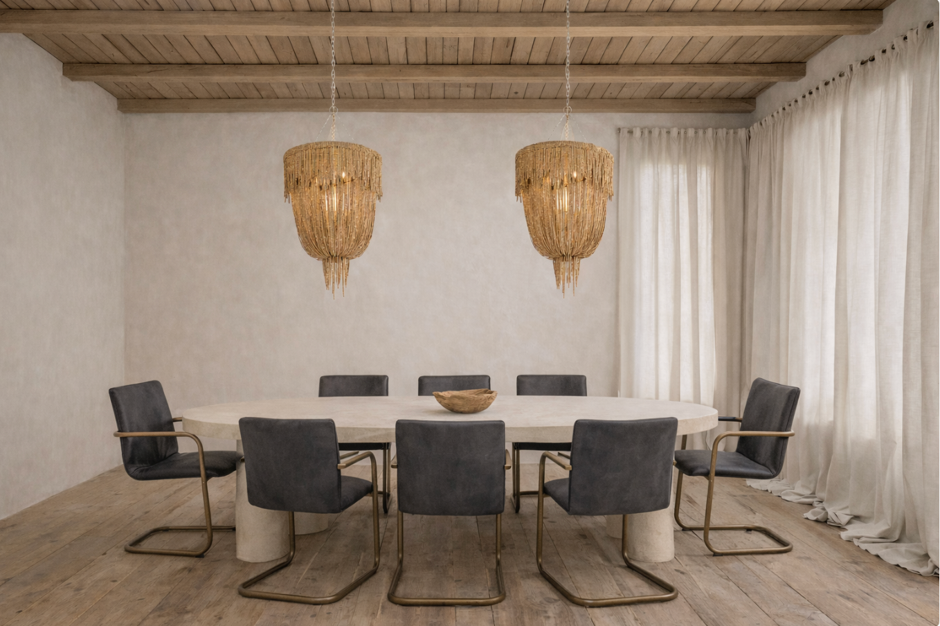 The 'Kofi' Coconut Bead Pendant is a stunning chandelier that measures 43cm in diameter and 61cm in height. Crafted with exquisite attention to detail, this pendant features natural coconut beads intricately arranged to create a textured, elegant design. Its organic materials and refined craftsmanship bring warmth and sophistication to any room, making it an ideal statement piece for living areas, dining rooms, or entryways. The pendant’s unique blend of natural elements and contemporary style adds depth and character, elevating your interior with a subtle yet captivating presence.
