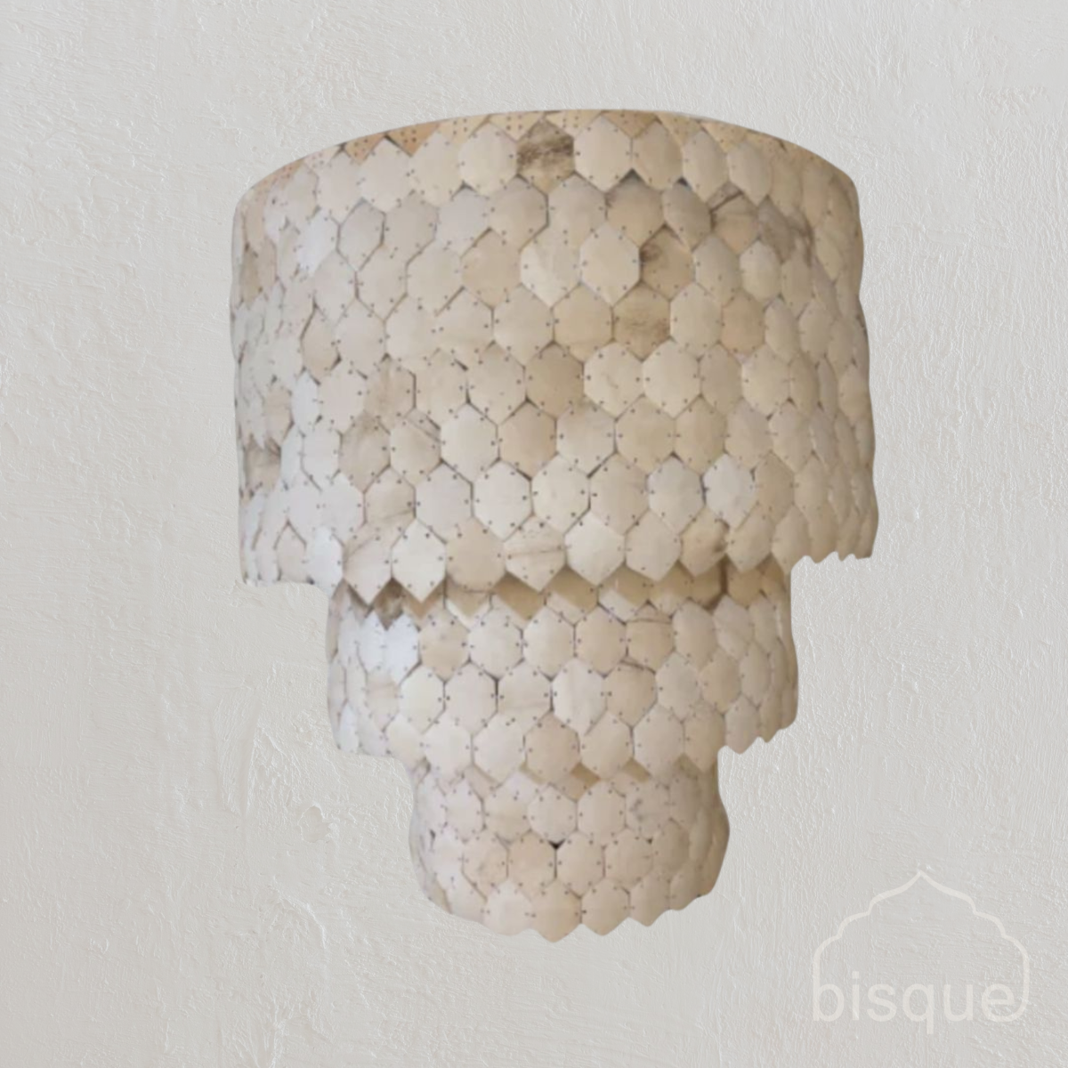 The Soleto Three Tiered Pendant is a sophisticated lighting piece crafted from natural coconut husk, showcasing expert hand carving in an octagonal design. This chandelier-style pendant features three distinct tiers, measuring 600mm across at the broadest top level and tapering gracefully to 300mm at the smallest bottom tier, with an overall height of 650mm. Its layered structure adds depth and texture, casting warm, inviting light that enhances any space with an organic yet refined aesthetic. Perfect for elevating interiors with a touch of artisanal elegance and sustainable charm.