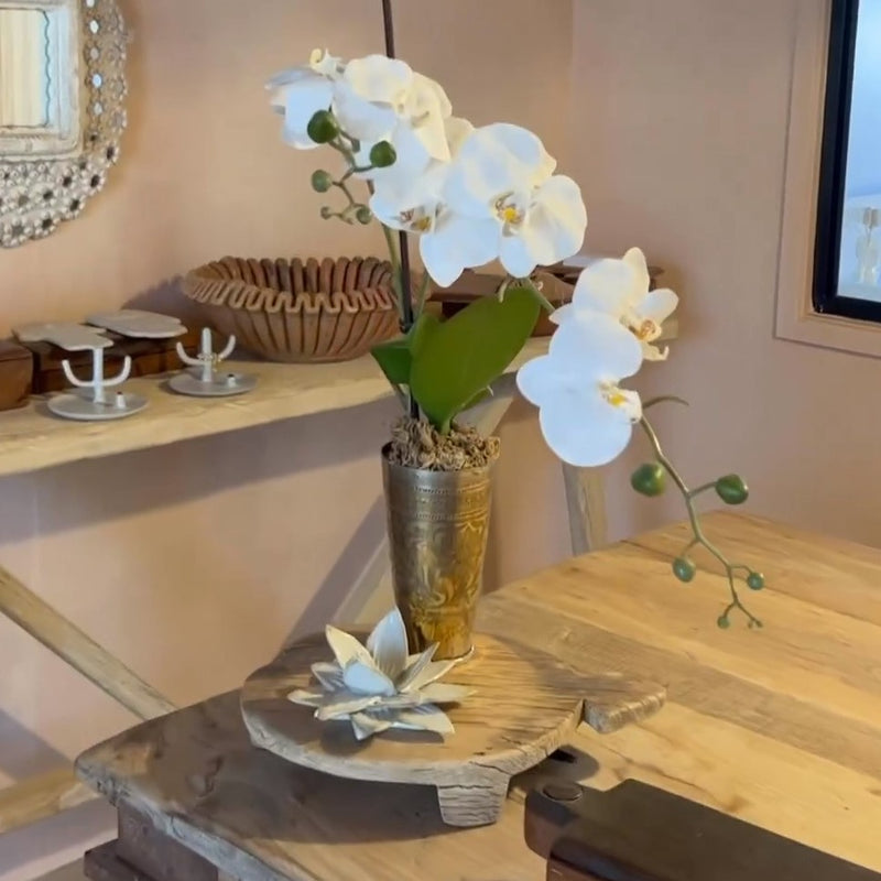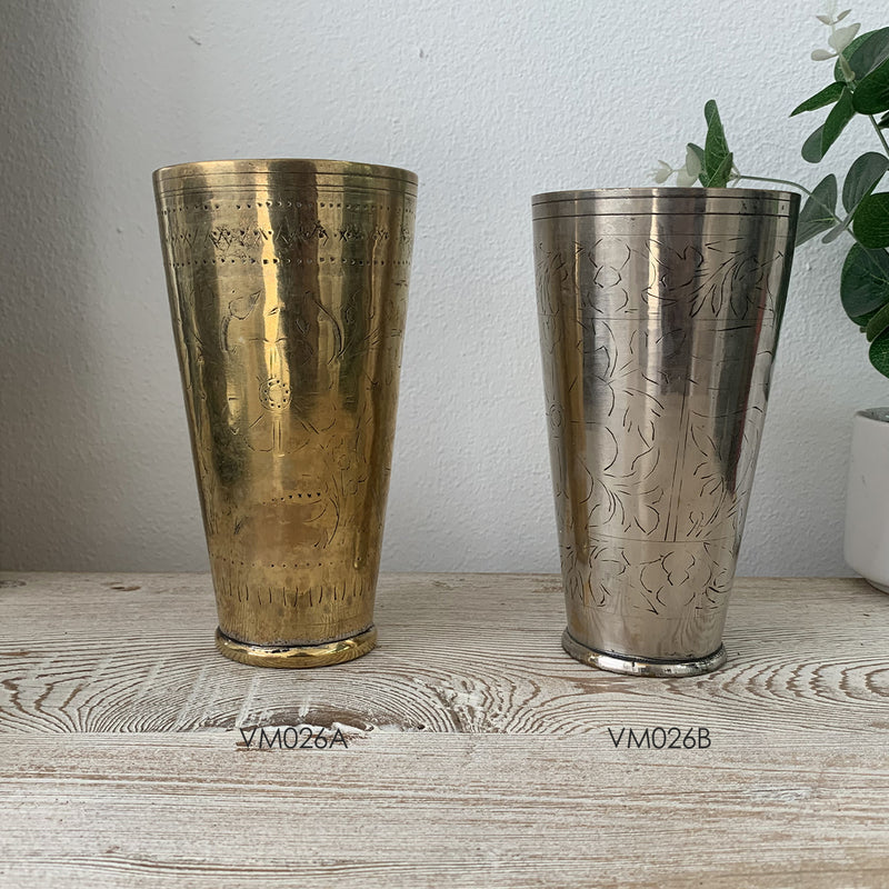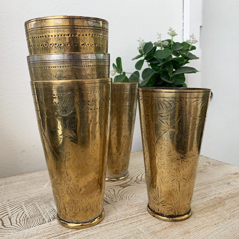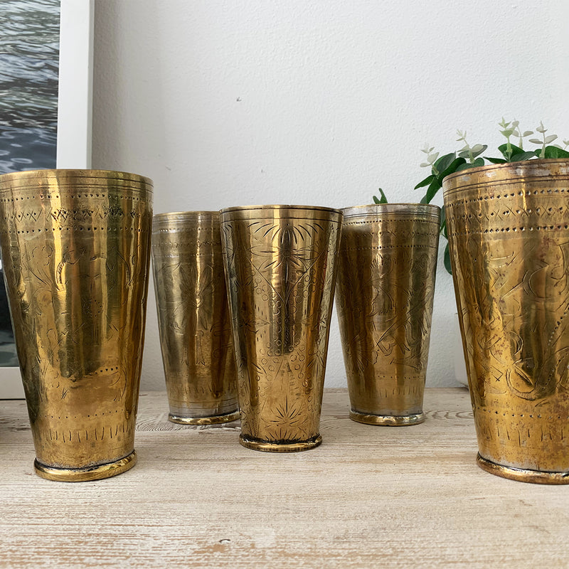 This Indian Brass Lassi Cup, featuring a vintage patina, was traditionally used to enjoy lassi, a classic yogurt-based drink. Handcrafted in India, each cup varies in style and size, generally measuring 9-10cm in diameter and 16-17.5cm in height. Variations in brass tone, coloration, and dimensions are natural and add to the cup’s authentic charm. Any imperfections in the brass are part of its history and are considered unique characteristics rather than defects.