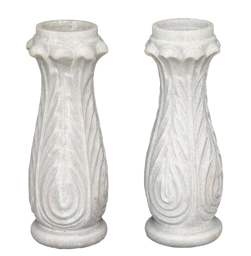 The Fouzo White Marble Lotus Flower Candleholder is a stunning hand-carved masterpiece from India, embodying both artistic skill and spiritual symbolism. Featuring an intricate lotus flower design with elegant swirl detailing, this candleholder measures 15cm in diameter and 41cm in height, weighing 12kg, which speaks to its solid craftsmanship and quality. Its pristine white marble surface adds a touch of refined luxury, making it a captivating centerpiece for any room. Sold separately, the Fouzo candleholder brings a serene and sophisticated ambiance, perfect for enhancing meditation spaces or elevating your home décor with timeless beauty.