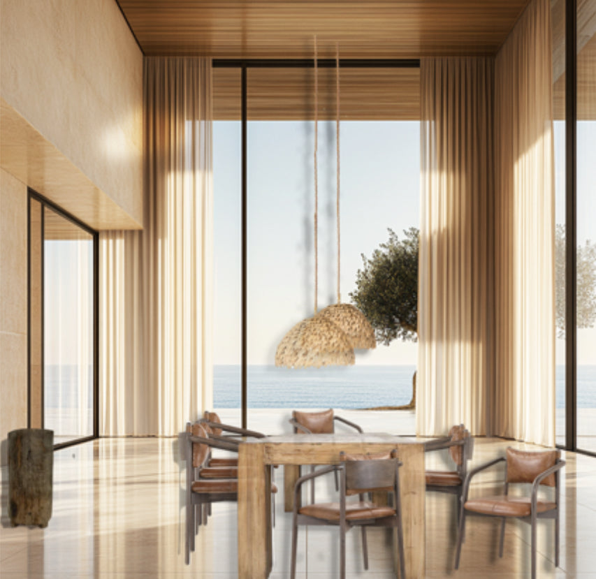 The Italo is shown with the Buono leather chairs and Sadé pendants in the images below.