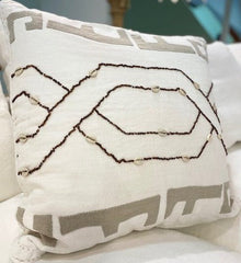 Linen cushion filled with feathers, hand beaded and stitched in India, featuring shell accents and appliqué work with African inspiration. Measuring 55cm x 55cm, this cushion brings a distinctive and elegant touch to any room.