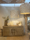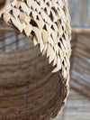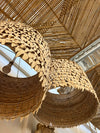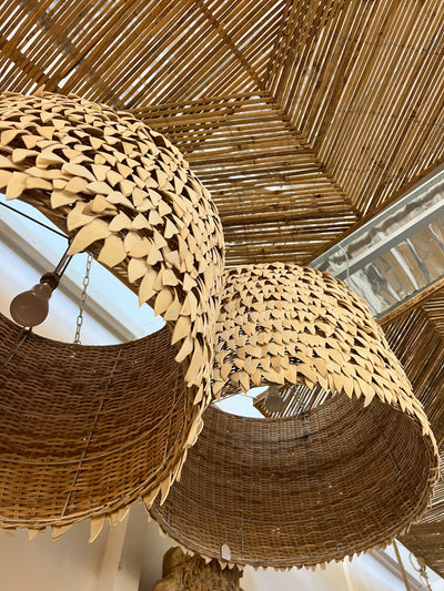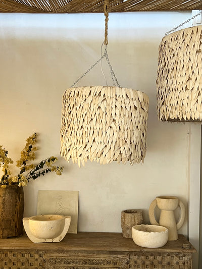This elegant pendant light features hand-cut coconut slices layered on a rattan cylinder base, offering beauty both inside and out. Its organic form is ideal for enhancing a dining table—whether paired or solo—hanging low to evoke a subtle, relaxed sophistication. Equally captivating beside a bed or as a bathroom feature, it casts a gentle, warm glow. Designed by Bisque and available wholesale and retail, it comes in two sizes: Large (70 cm diameter x 65 cm height) and Small (56 cm diameter x 50 cm height).