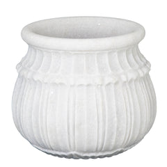 The Baku White Marble Pot is a masterfully hand-carved piece from India, measuring 37cm in diameter and 31cm in height, with a bowl depth of 25cm. Weighing 32kg, this substantial pot serves as a stunning decorative element, ideal for showcasing floral arrangements, used as a planter or as a standalone statement piece. Each pot is uniquely crafted by skilled artisans, resulting in natural variations in design, pattern, and color that enhance its distinctive beauty. This exquisite marble pot combines timeless elegance with artisanal craftsmanship, making it a sophisticated addition to any interior setting.