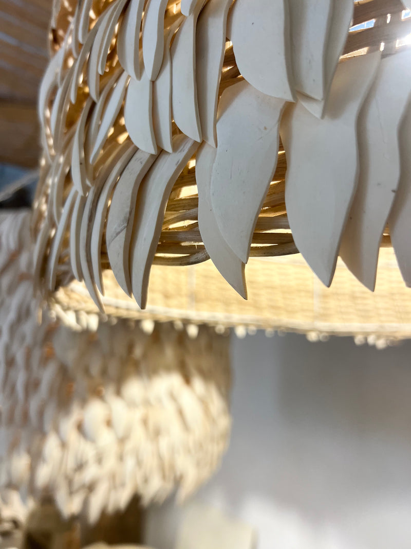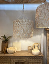 This drum-shaped pendant light is crafted from hand-cut coconut slices, offering a natural, organic form. Ideal for enhancing a dining table—whether paired or solo—it hangs low to evoke a subtle, relaxed elegance. Equally striking beside a bed or as a feature in a bathroom, it casts a gentle, warm glow. Designed by Bisque and available wholesale and retail, it comes in two sizes, measuring 70cm in diameter by 65cm in height.
