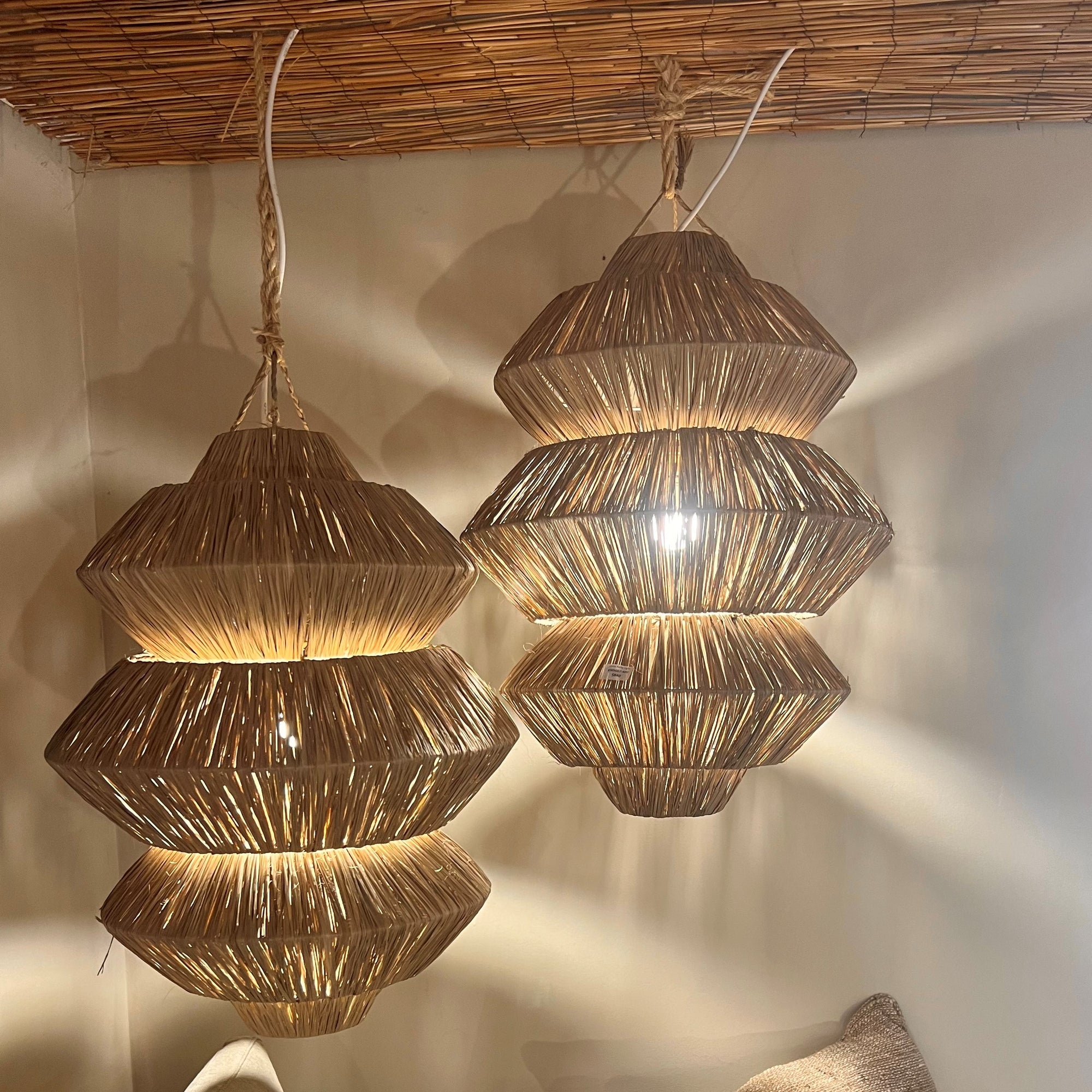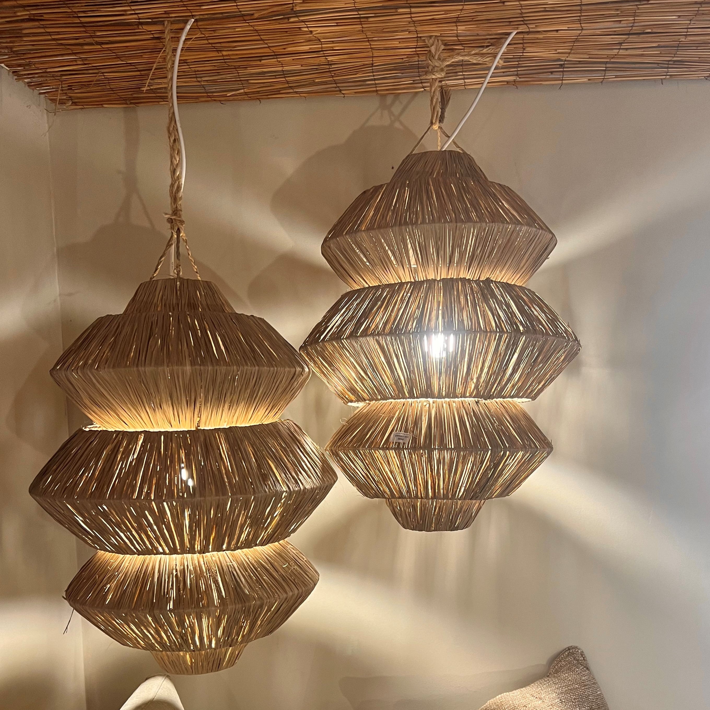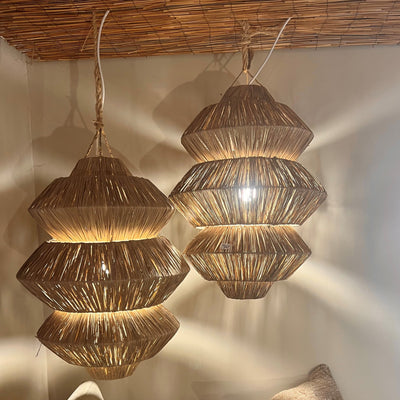 Enrich your living space with the 'Abina' Raffia Pendant Light, a sophisticated blend of modern design and natural elegance. This triple-tiered pendant features a warm, textured raffia construction that casts a soft, inviting glow. Measuring 55cm in diameter and 75cm in height, its unique layered silhouette adds depth and contemporary charm to any room. Perfect for creating an ambient atmosphere, the Abina pendant light complements both minimalist and eclectic interiors with its refined yet organic presence.