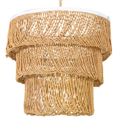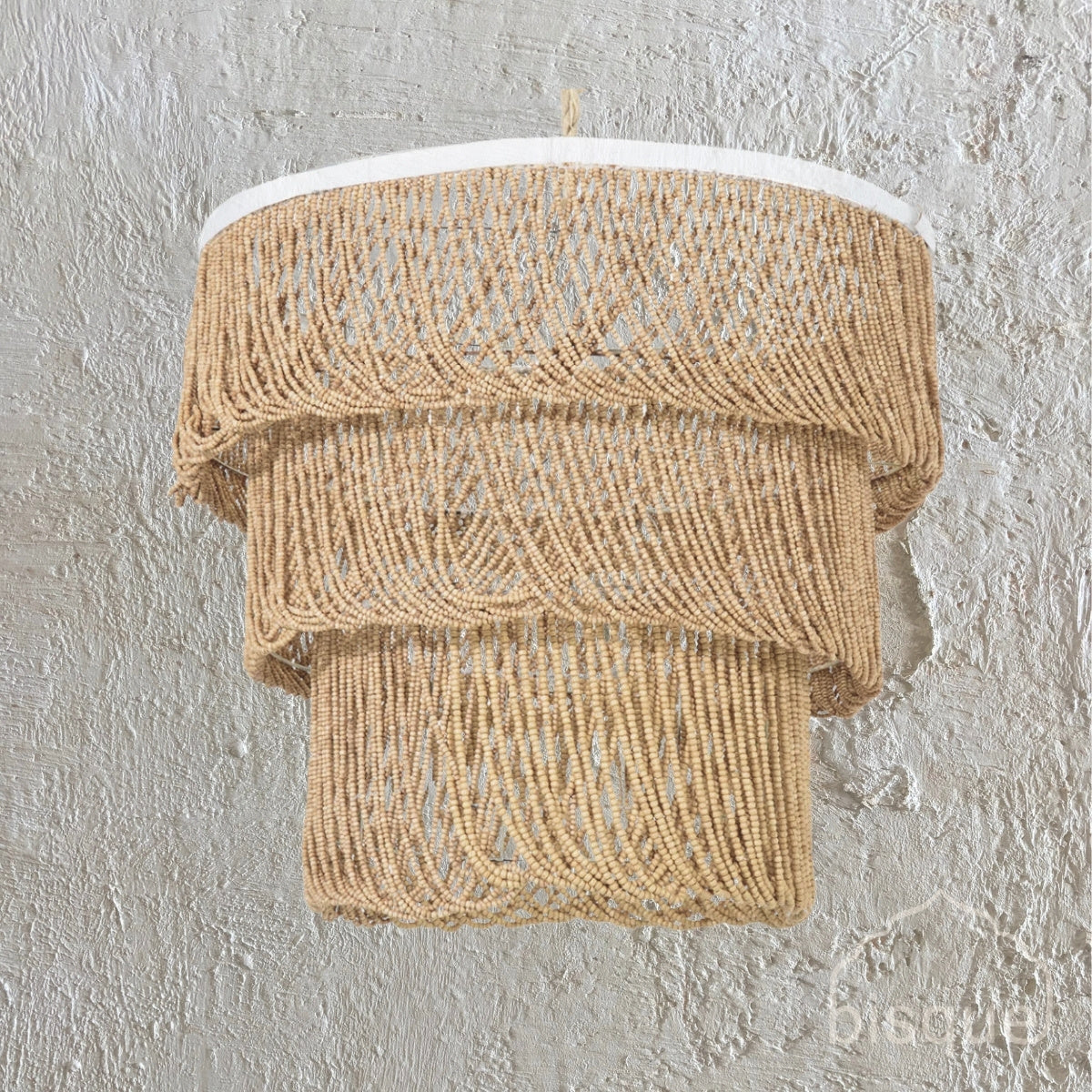 The Eroni Coconut Bead Pendant showcases a sophisticated design crafted from light brown coconut husk beads. These small beads are meticulously strung together to form an elegant chandelier shape, measuring 60cm in diameter and 50cm in height. This pendant light brings a natural, refined touch to any space, highlighting the unique texture and warmth of the bisque aesthetic. Ideal for adding subtle organic charm with a contemporary edge.