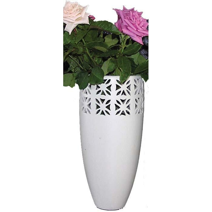 White Ceramic Torpedo Vase. Features detailed cut-outs.