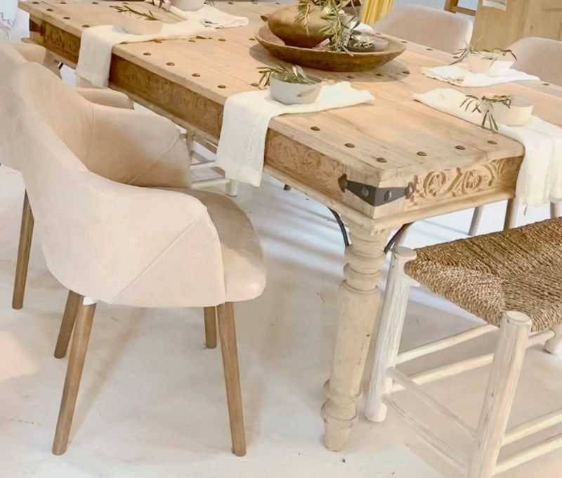 The Manil Wooden Dining Table exudes timeless charm with its exquisite hand-carved details along the sides and delicately sculpted legs. Crafted as an antique piece, it embodies a classic elegance that enhances any dining space. Measuring 180cm in length, 90cm in width, and 76cm in height, this six-seater table offers ample room for gatherings while maintaining an intimate atmosphere. Its refined craftsmanship and subtle detailing make it a sophisticated centerpiece, perfect for those who appreciate artistry and tradition in their home furnishings. The Manil table seamlessly blends delicate design with enduring functionality, elevating your dining experience.